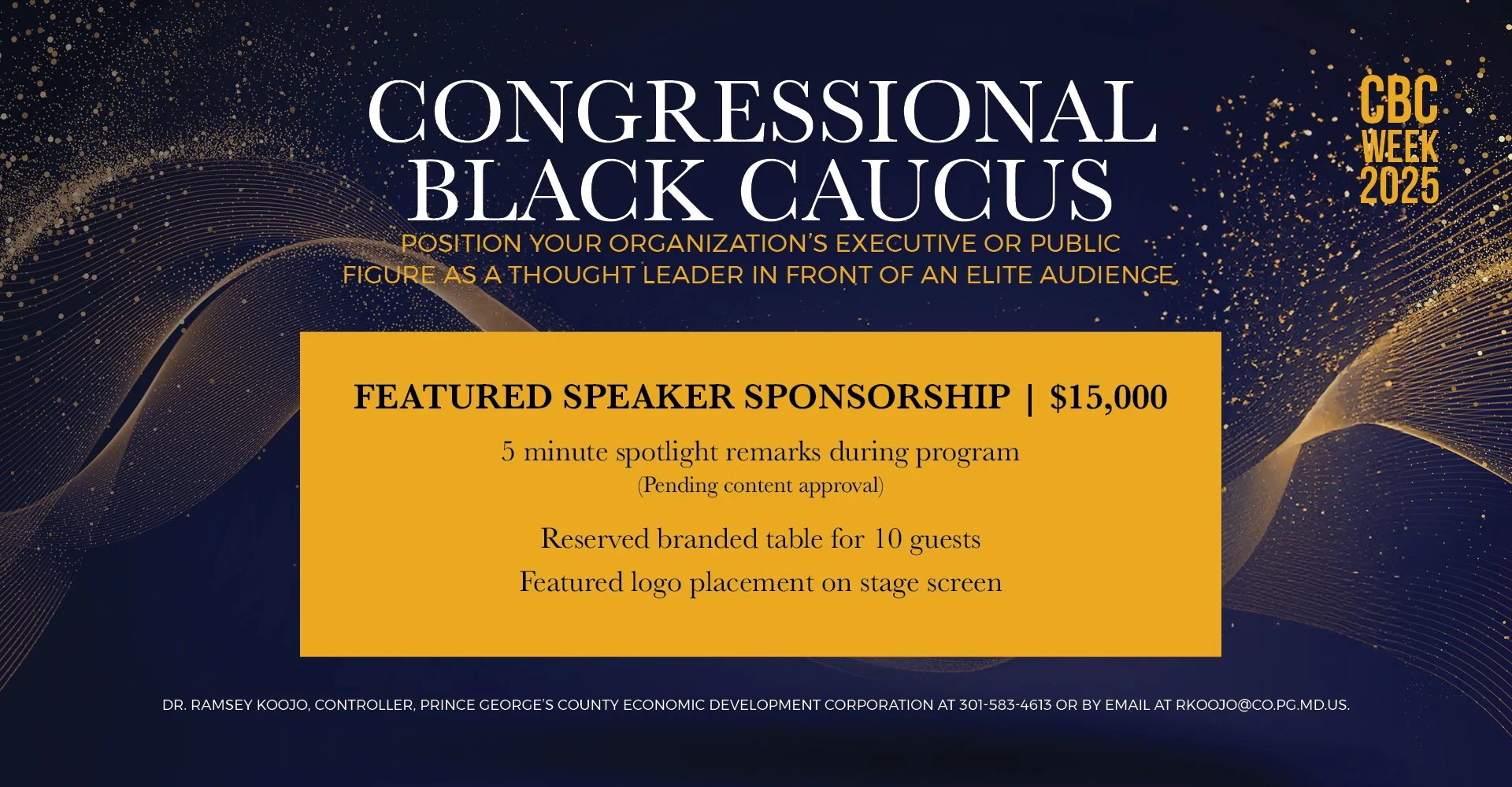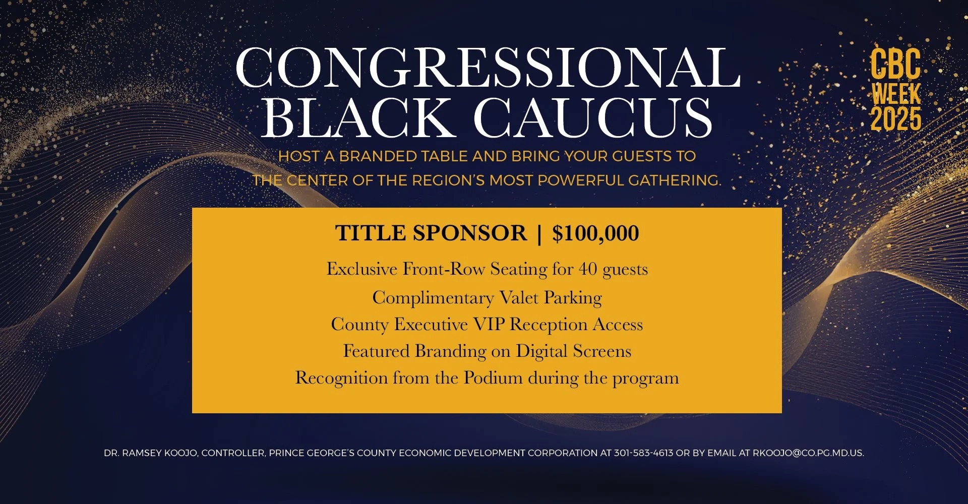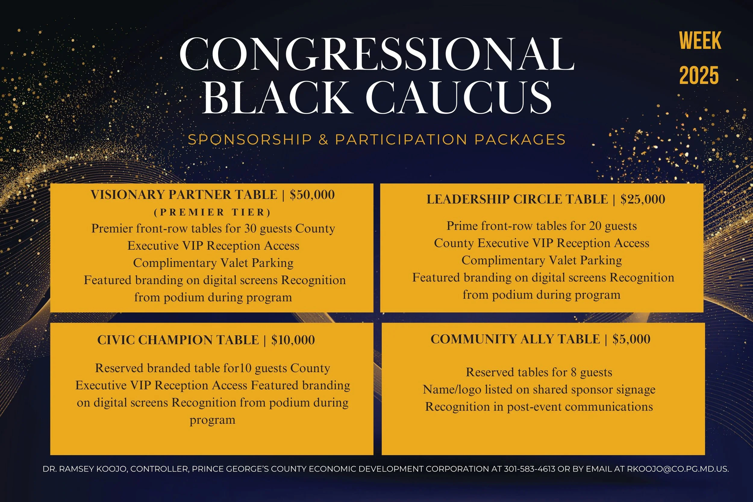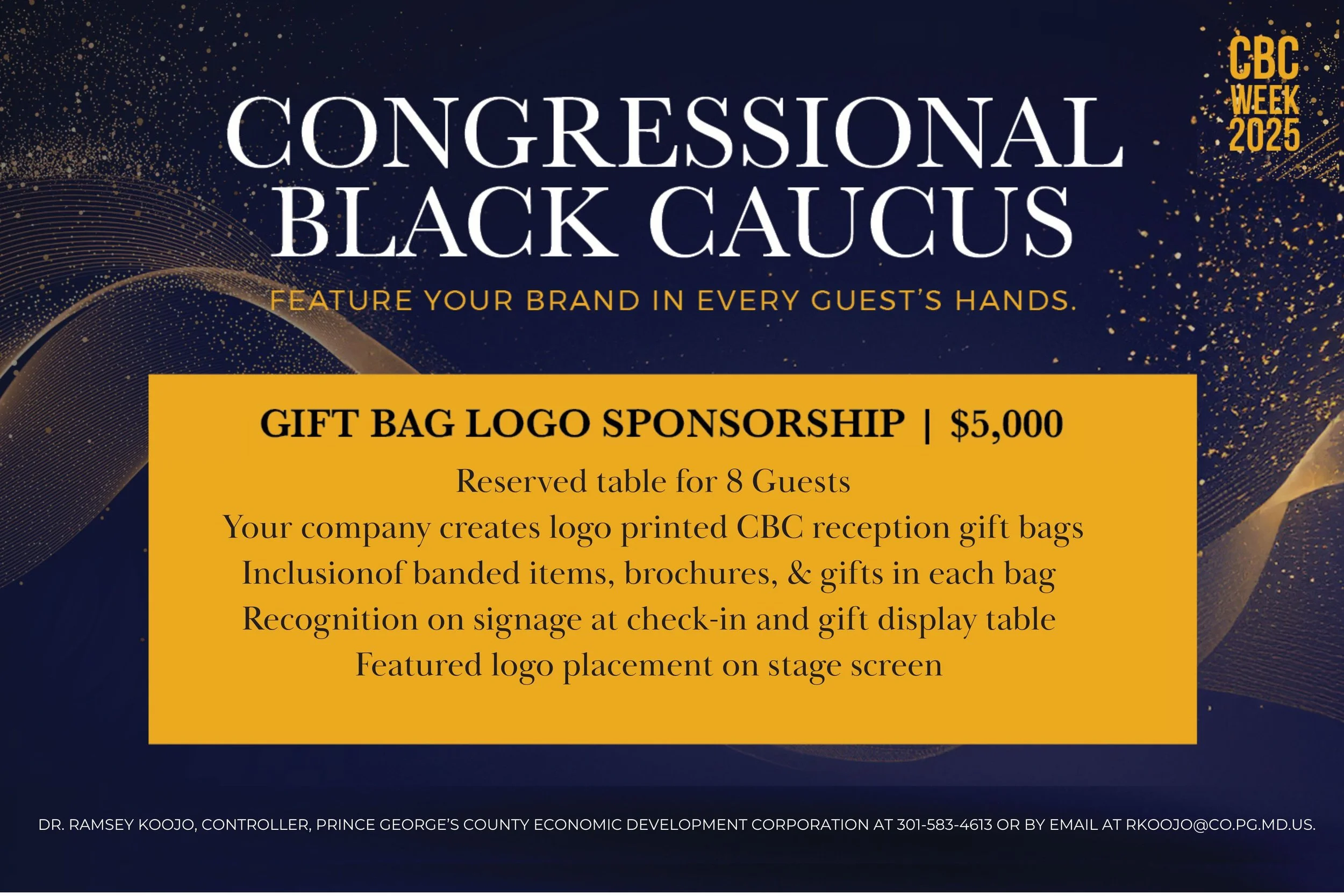 Space is limited. All sponsorships are confirmed on a first-come, first-approved basis. To secure your fully tax-deductible sponsorship and receive further information, contact Dr. Ramsey Koojo, Controller, Prince George’s County Economic Development Corporation at 301-583-4613 or by email at rkoojo@co.pg.md.us.
