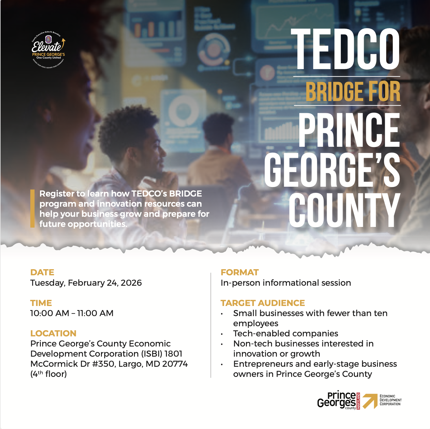 Join Prince George’s County Economic Development Corporation and TEDCO for an informational session on the TEDCO BRIDGE program. This one-hour, in-person workshop is designed for small businesses with fewer than ten employees, including both tech-enabled and non-tech businesses such as cleaning companies, construction firms, restaurants, and service providers.